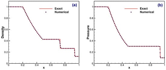 We take into consideration 400 grid points for the simulations. The pressure and density distributions between the exact and numerical data are compared in Figure 2, illustrating the strong agreement between the exact and numerical solutions.