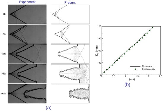 Comparison of experimental “Reproduced with permission from [54], Cambridge University Press, 2016” and numerical data for a shock wave interaction with V-shaped air/ interface at and vertex angle : (a) numerical Schlieren; (b) variation in the upstream interface displacement.