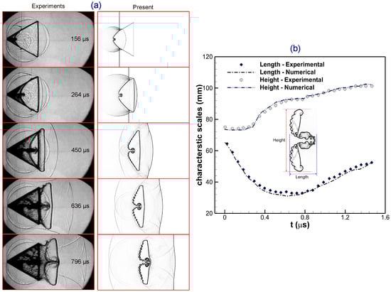 Comparison of experimental and numerical data for a shock wave interaction with forward triangular light interface: (a) numerical Schlieren; (b) developing interfacial length/height. “Reproduced with permission from [20], MDPI, 2024”.