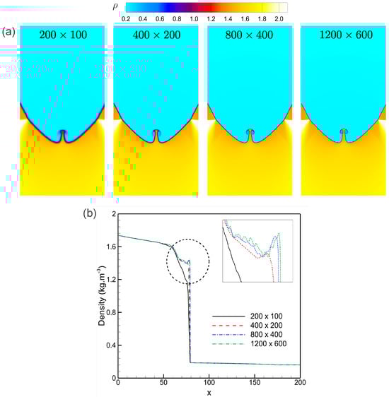 Grid refinement analysis: (a) density contours and (b) profiles of density distributions along the center line for the computed V-shaped /He interface at with four grid resolutions, including , , , and grid points.
