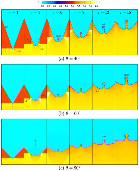Effects of vertex angles on the shock wave interaction with V-shaped /He interface: time evolution of density contours at (a) , (b) , and (c) . IS, incident shock; CRS, curved reflected shock; IJ, inward jet; INF, initial interface; TS, transmitted shock; FPS, free precursor shock; TNR, twin von Neumann refraction; TP, triple point; MS, Mach stem; KHI, Kelvin–Helmholtz instability.