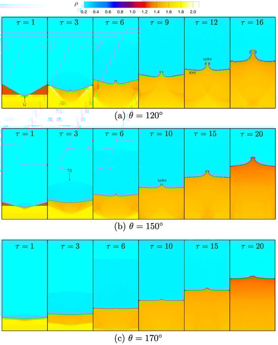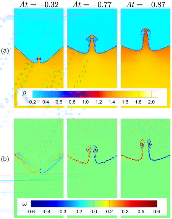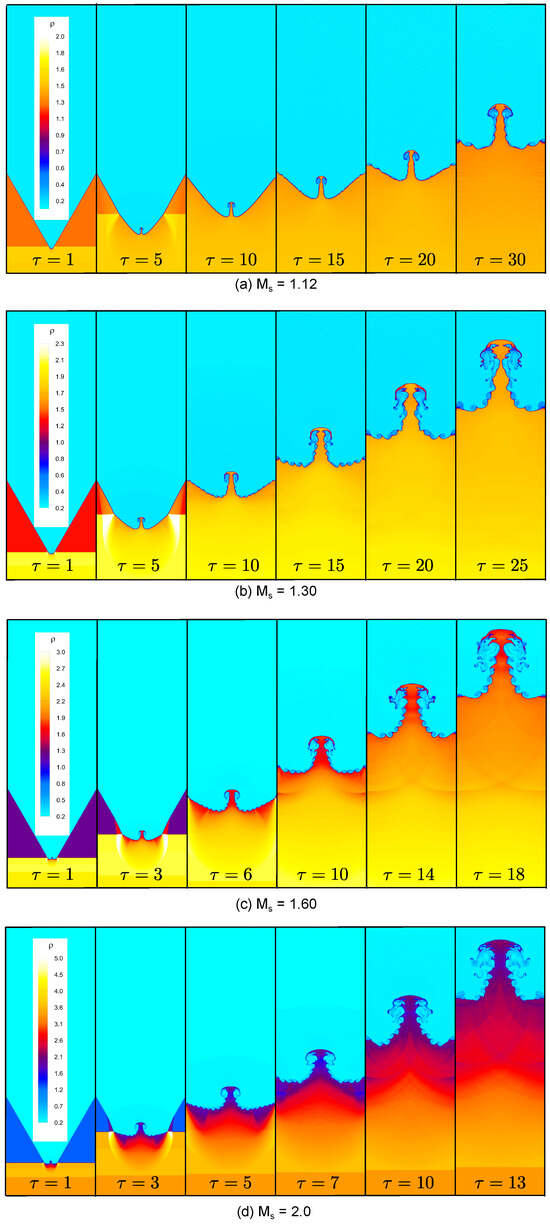 In the following sections, we use the normalized time to display flow morphology snapshots. The characteristic time is used to standardize the actual computational time. Here, we obtain , where is the initial wavelength of the V-shaped interface and is the IS wave speed.