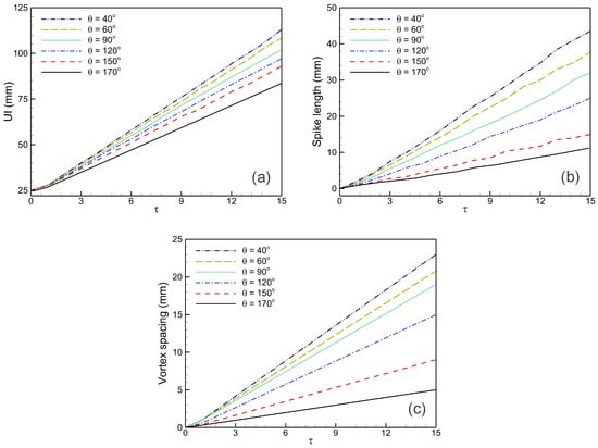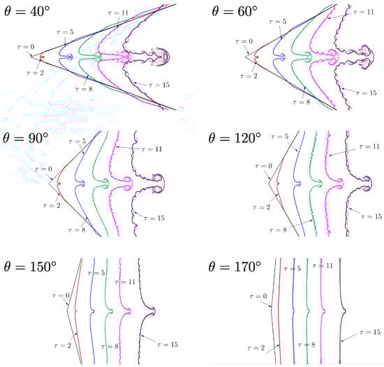 The vertex angles’ effects on the interface deformation history of the shock wave interaction with the V-shaped /He interface are illustrated in Figure 8. This broadens the scope of our investigation into the impacts of the vertex angles. Following its passage through the IS wave, the frontal component of the V-shaped contact is crushed in that particular direction. As soon as the IS wave makes contact with the upstream section of the V-shaped interface at the beginning of the contact, the compression event begins. In the early instants at all vertex angles, the downstream of the V-shaped interface pushes forward due to the action of the IS wave. This occurs regardless of the angle of direction. The top and bottom downstream corners of the V-shaped interface eventually fold forward toward the axis, acquiring a divergent form. This occurs over the course of time. Baroclinic vorticity causes a spike to form at the frontal part of the V-shaped interface. The generated spike continues to enlarge with time. Compared to a small vertex angle, the magnitude of these rolled-up vortices on the interface is less in the case of . For all five vertex angles, the rolled-up small-scaled vortices and the spike exhibit complete control over the flow field of the shock wave interaction with the V-shaped /He interface.