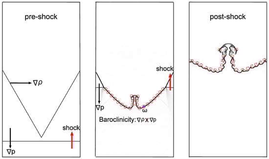 The Richtmyer–Meshkov instability (RMI) [1,2] is a physical phenomenon that occurs at the interface of two fluids with different densities when they are impulsively driven, typically by a shock wave. The interface perturbation increases in magnitude and results in material mixing because it is caused by pressure perturbation on both sides of the interface, as well as baroclinic vorticity that is deposited there as a result of the pressure and density gradients being out of alignment [3]. The perturbation increases linearly for the RMI until its amplitude approaches that of its wavelength. Classic nonlinear characteristics of flow are the creation of bubbles and spikes, which represent the heavier fluid penetrating into the lighter fluid and the lighter fluid penetrating into the heavier fluid, respectively [4,5]. If the shock wave is strong enough and the initial disruption spans a wide range of scales, turbulent flow may be encouraged. Inertial confinement fusion (ICF), in which shock waves compress tiny capsules containing a deuterium–tritium fuel, is a process in which the RMI is essential [6]. The idea of ICF is to get the capsule’s interior hot enough and pressurized enough to ignite the fuel. However, the fusion yield is decreased and ignition failure may result from the RMI-induced mixing of the inner fuel and outer shell. Numerous in-depth analyses of the RMI have been reported within the last few decades [7,8,9].