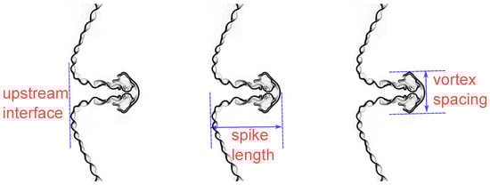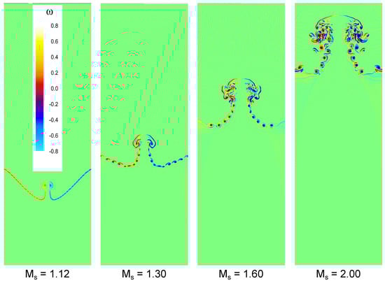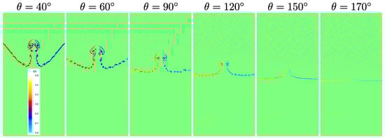 Figure 10 shows the vertex angles’ effects on the vorticity distribution of the shocked V-shaped /He interface at time instant . The vorticity is often at zero during the initial stages of the interaction as a general rule. At an early stage in the passage of the IS wave over the V-shaped interface, the discontinuity between the gas He and the ambient gas is the location where baroclinic vorticity is largely deposited locally on the interface. It is possible to see that the top and bottom of the V-shaped interface are where there is the most vorticity. This is because the pressure and density gradients in these areas are not perpendicular to one another. On the other hand, it is equal to zero in situations where the pressure and density gradients at the interface parallel each other along the axis of the interface. Significant amounts of positive and negative vorticity are produced on the top and bottom of the V-shaped contact. Upon an examination of Figure 10, it is evident that a significant quantity of vorticity forms at the interface’s top and bottom horizontal sides, respectively, both positive and negative. At both the top and the bottom of the V-shaped contact, there is a very small quantity of both positive and negative vorticity. Additionally, a minute amount of vorticity, also known as either positive or negative vorticity, can be observed at the spike head, which is located on either the upper or lower plane of the left upstream side. Considering that this positive (negative) vorticity on the upper (lower) jet head is responsible for the enhanced spike movement, it is possible that there is a relationship between the creation of jets and the deposition of vorticity. A significant gap in the vorticity production is noticed during the interaction process for the various vertex angles in the shock wave interaction with the V-shaped /He interface. This gap is observed for the various vertex angles. For a smaller vertex angle (i.e., ), the shock wave encounters a steeper density gradient, resulting in a more intense vorticity generation due to the enhanced baroclinic effect. The shock wave reflects and refracts at more acute angles, leading to higher local vorticity concentrations near the vertex. The interaction can result in complex flow patterns, including the spike formation and enhanced mixing between the two fluids. For larger vertex angles (i.e., ), the shock wave interaction with the interface is more oblique, resulting in a less intense vorticity generation. The distribution of vorticity tends to be more spread out, and the interaction is less complex. The resultant flow field has a lower vorticity magnitude and less pronounced mixing compared to smaller angles. These rolled-up vortices become less noticeable as vertex angles increase. In conclusion, the primary process at tiny vertex angles resulting in rolled-up vortices leads to the creation of vorticity.