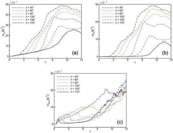 Figure 11 displays the vertex angles effects on the spatially integrated fields of average, dilatational and baroclinic vorticities in the shock wave interaction with a V-shaped /He interface. At the V-shaped interface, where the incident and reflected shock waves collide, the spatially integrated fields at are the minimum of the five vertex angles, as seen in Figure 11. At , these fields significantly improve. For every vertex angle, the spatially integrated fields increase over time, indicating an increasing entrained volume of ambient gas into the deformed V-shaped /He interface. More precisely, the average vorticity value rises when incident and reflected shock waves come into contact with the bubbles, as seen in Figure 11a. Because of the greater vorticities’ stimulation of gas mixing both inside and outside the interface, which accelerates energy transmission and consumption, the average vorticity intensity of the V-shaped interface may gradually drop. Surprisingly, during the interaction, both vorticity production factors reach considerable values. Due to compressibility effects from tiny regions of expansion and compression, plotting the dilatational vorticity generating term displays locally stretched structures surrounding the vortex core, as seen in Figure 11b. Figure 11c shows how the plot of the baroclinic vorticity production term, which represents the vorticity generated by contact discontinuities and reflected shock structures, represents the misalignment of pressure and density gradients. The vortices formed by the shock wave–V-shaped interface contact help to mix the surrounding gas with the V-shaped He interface. The spatially integrated fields show their maximum development rate, with much greater vorticities, when the reflected shock waves strike the deformed bubble again. At that point, the flow field’s rate of expansion decreases. Consequently, the evolution of the spatially integrated fields may reveal a simple non-monotonic connection between the vorticity production terms and the ambient gas.