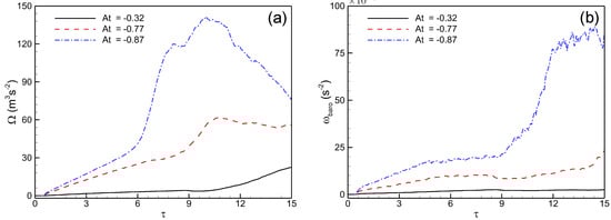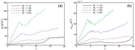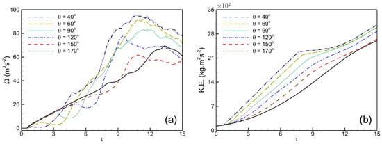 Figure 12 shows the vertex angles’ effects on the spatially integrated fields of enstrophy and kinetic energy evolution in the shock wave interaction with the V-shaped /He interface. There is no enstrophy up until the shock wave reaches the upstream pole of the V-shaped contact. For smaller vertex angles, the shock wave encounters a steeper density gradient, leading to a more intense baroclinic vorticity generation at the interface. This results in a rapid initial increase in enstrophy. The enstrophy graph, as illustrated in Figure 12a, typically shows a steep rise shortly after the shock wave impacts the V-shaped interface, reaching a peak value quickly. This peak corresponds to the maximum vorticity generation due to the concentrated shock–interface interaction. After the initial peak, the enstrophy may decrease as vortices dissipate and interact, causing the vorticity field to become more diffused. However, the decay rate may be slower due to the formation of strong vortex structures that persist over time. High enstrophy is a result of a strong shear and intense vortex formation near the sharp vertex, where the shock-induced density and pressure gradients are most pronounced. On the other hand, for larger vertex angles, the shock wave encounters a more gradual density gradient, leading to a less intense baroclinic vorticity generation. The vorticity production is spread out over a larger area. The enstrophy graph typically shows a more gradual increase, reaching a lower peak value compared to smaller angles. The peak occurs later in time due to the less focused interaction. Enstrophy may decrease more rapidly as the generated vorticity is less intense and more spread out, leading to quicker dissipation. Lower enstrophy results from a weaker vortex formation and less intense shearing near the blunt vertex, where the shock-induced gradients are more diffused.