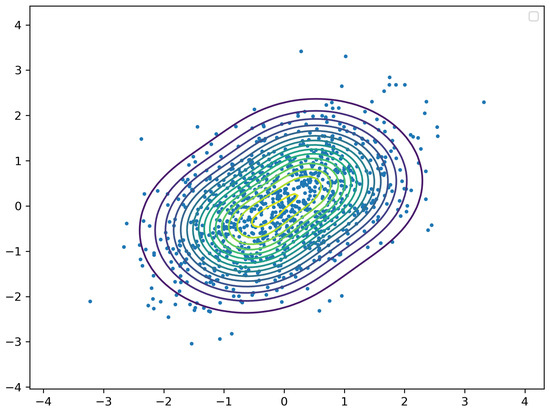 This 2D contour plot depicts the fit of a Gaussian mixture model to a sample of size 1000 from a correlated bivariate normal distribution with zero means, unit variances, and correlation . The fitted normal mixture is comprised of two normal densities, each with zero correlation. Their estimated weights are essentially the same, with the first one . The other parameter estimates are , , , and .
