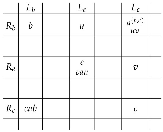 Choose the idempotent transformation . It also has rank 3, and therefore, it belongs to the same -class of the semigroup that contains β and γ. The -classes obtained as intersections of -classes and -classes determined by β, γ, and ε are shown in Figure 6.