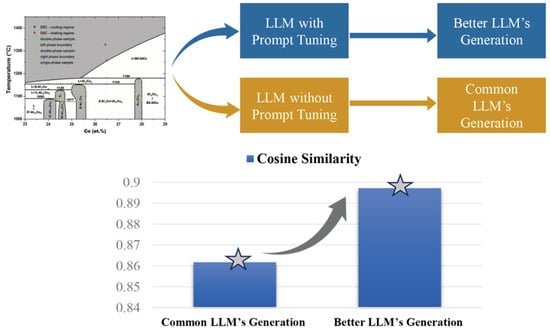The experimental design of this study was executed on the Windows operating system, involving hardware configurations that included an Intel(R) Core(TM) i5-12500H 12th Gen processor, 16.0 GB RAM, and NVIDIA GeForce RTX 3060 GPU, sourced from Intel Corporation (Santa Clara, CA, USA) and NVIDIA Corporation (Santa Clara, CA, USA). The software environment comprised Anaconda version 4.12.0, a Python 3.8 environment, along with libraries such as torch 2.3.0, sentence-transformers 2.7.0, and scipy 1.10.1. Additionally, all inference results from the LLM were obtained through the ChatGPT-4.0 API provided by OpenAI. The outputs of the LLM before and after instruction tuning were used to calculate sentence embeddings using the Hugging Face open-source pre-trained model ‘all-MiniLM-L6-v2’. These embeddings were then utilized to evaluate the LLM’s performance on the phase diagram comprehension task.