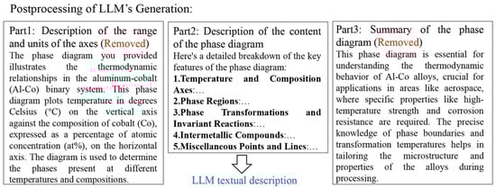 Large Language Models (LLMs) are advanced artificial intelligence (AI) technologies designed to understand and generate natural language [,]. Recently, we have witnessed a surge in the development of LLMs, including OpenAI’s GPT-3 [] and GPT-4 [], Google’s Gemini [], and Meta’s LLaMA-1 [] and LLaMA-2 []. These models excel in a variety of downstream tasks, such as natural language understanding (NLU) [,], natural language generation (NLG) [,], complex reasoning [,], biomedical tasks [,] and code generation [,]. Phase diagrams are critical tools in materials science for understanding the performance of materials under different conditions []. Currently, the annotation of phase diagrams relies mainly on manual effort. Phase diagram images are generated using thermodynamic calculation software such as Thermo-Calc [] and Pandat [], after which domain experts describe them using text based on their understanding of the diagrams. Eventually, these phase diagram images and textual descriptions are compiled into reference books [] for researchers to consult and use. With the rapid development of materials science, traditional manual annotation methods can no longer meet the needs of new material development. According to current studies, no literature or research has yet been published on the use of LLMs to assist in the annotation of material phase diagrams. Therefore, the efficient recognition and annotation of material phase diagrams using LLMs is expected to become a future research trend.