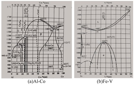 Complex system Al-Co and simple system Fe-V: (a) Al-Co, with seven phase transformations. A peritectic transformation occurs at 945 °C; at 1093 °C, a peritectic reaction takes place; another peritectic reaction occurs at 1135 °C; at 1170 °C, yet another peritectic reaction occurs; at 655 °C, an eutectic reaction occurs; at 1400 °C, an additional eutectic reaction takes place; and at 300 °C, an eutectoid reaction is observed. (b) Fe-V, with one phase transformation. A solid-state phase transformation occurs at 1219 °C.