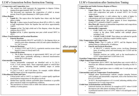 LLM’s generations for the Al-Co system before and after instruction tuning. (Left) Textual description of the Al-Co phase diagram by the LLM before instruction tuning. (Right) Improved description after instruction tuning, showing enhanced organization, standardization, and accuracy.
