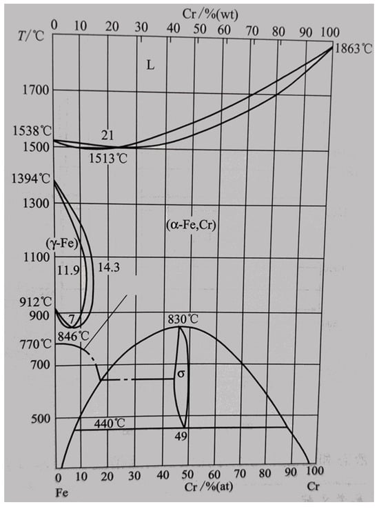 The original dataset utilized in this study is sourced from the Phase Diagram Handbook, which contains numerous binary metal system phase diagrams, accompanied by expert textual descriptions []. These diagrams provide critical information about the phases present in various binary metal systems. In particular, we have compiled and digitized 13 commonly used binary metal phase diagrams along with their corresponding expert textual descriptions. Figure 3 provides an example of the Cr-Ni binary phase diagram and the corresponding textual information from the reference source.