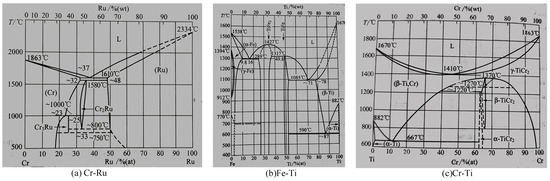 Three phase diagrams in complex systems. Top-performing phase diagrams in complex systems: (a) Cr-Ru, (b) Fe-Ti, and (c) Cr-Ti, with transition reactions of 5, 5, and 4, respectively.