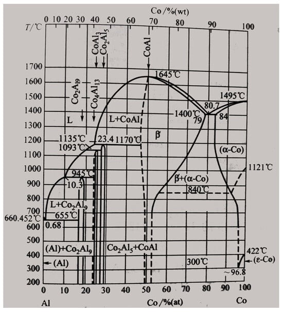 Al-Co phase diagram. The Al-Co phase diagram is highly detailed, labeling all phase names, including four compounds (Co2Al9, CoAl3, Co2Al5, CoAl, Co4Al13), Co-based solid solutions (-Co, -Co), and Al-based solid solution (Al), along with each phase transition’s temperature, composition, and involved phases.