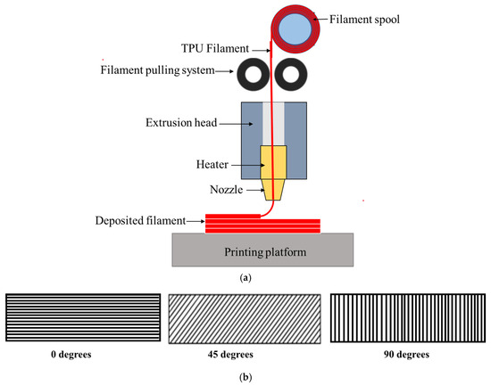 (a) Schematic of FFF 3D printing process; (b) schematic of the types of raster angle.