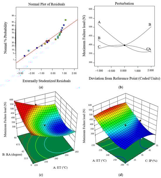 Plots for the maximum failure load model: (a) normal residual plot, (b) perturbation graph, (c) response surface between ET and RA, and (d) response surface between ET and IP.