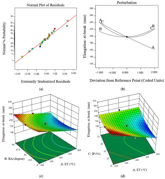 Plots for the elongation at break model: (a) normal residual plot, (b) perturbation graph, (c) response surface between ET and RA, and (d) response surface between ET and IP.