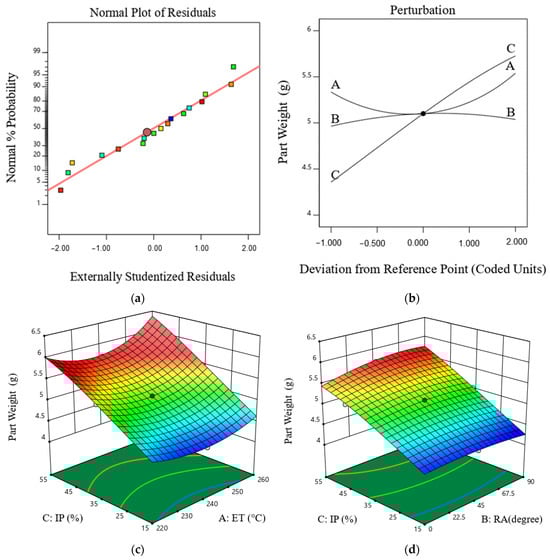 Plots for the part weight model: (a) normal residual plot, (b) perturbation graph, (c) response surface between ET and IP, and (d) response surface between RA and IP.