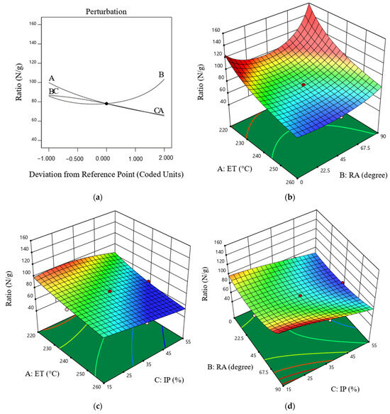 Plots for the ratio of the maximum failure load to part weight: (a) perturbation graph, (b) response surface between ET and IP, (c) response surface between RA and IP, and (d) response surface between RA and IP.
