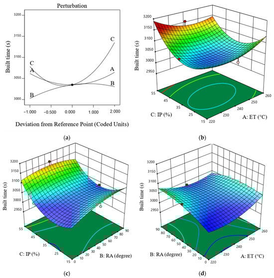 These days, estimating build time is one of the most important aspects of manufacturing science, particularly in mass production. Build time is regarded as an objective function in the current study. The goal of the FFF process is to reduce build time (BT) in order to lower costs. The build time perturbation plot is shown in Figure 7a. It is possible to reach the conclusion that build time is significantly influenced by infill percentage. However, when the IP was increased, the BT significantly decreased. This is because as the infill percentage increases, more filament is deposited, which in turn extends the build time. Figure 7b illustrates the variation in the build time with the IP and the ET. The results show that the BT is obtained at the highest IP (55%) and lowest ET (220 °C). Figure 7c,d illustrate that the raster angle has a minimal effect on the build time of the TPU parts. According to Table 2, the TPU part printed at an IP of 55%, an RA of 45°, and an ET of 240 °C had the highest build time, 3155 s (sample #6).