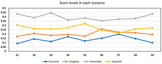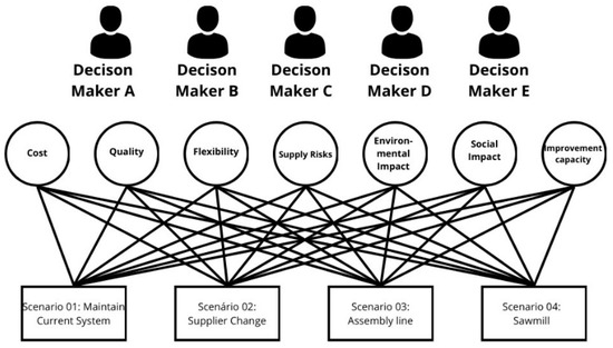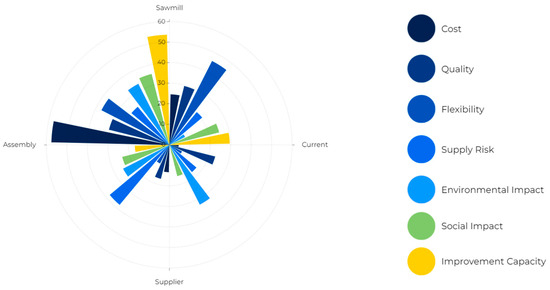 Regarding the social impact, Decision-makers A and B underscored the importance of considering scenarios that promote employment and enhance community relations, particularly favouring the assembly scenarios and, notably, the optimal sawmill scenario, as beneficial contributions. Conversely, Decision-maker C espoused a more cautious stance, prioritizing the preservation of the company’s image and avoiding scenarios that may result in internal waste generation, preferring the supplier exchange scenario to mitigate potential adverse impacts on the company’s reputation. Decision-maker D underscored the importance of waste reduction to safeguard the company’s image, proposing that internalizing assembly represented a viable option to create jobs while minimizing waste generation. Lastly, Decision-maker E adopted a neutral stance toward the proposed scenarios, indicating a lack of definitive preference regarding social impact. The assembly scenario, shown in Table 11, was identified as the most socially beneficial of the proposed options, with the increased workforce, the introduction of a new role within the factory, and the avoidance of waste generation associated with the sawmill scenario all contributing to this conclusion.