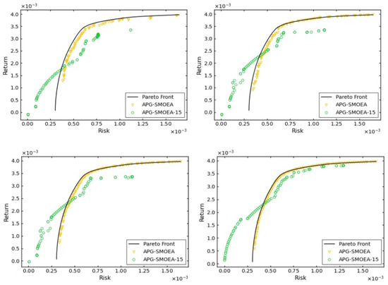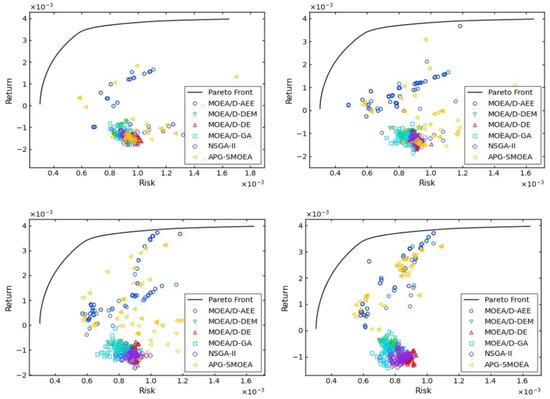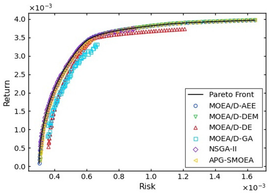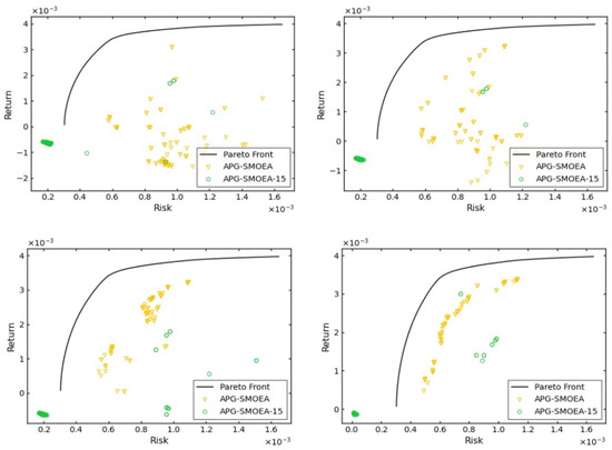 In MOPs, optimizing a single objective can come at the cost of other objectives, while achieving multiple optimal objectives may require finding an optimal constraint relationship between them [63]. The classical portfolio optimization, for example, has to satisfy both the highest return and the lowest risk. In reality, return and risk are often constrained, as achieving higher returns may lead to higher risks, while lowering risks may result in lower returns. Similar classical problems exist in the fields of recommendation systems, traffic logistics, path planning, and financial investment. Therefore, the MOPs have been a more important research direction in the field of scientific research, and the classical MOEA algorithm has proposed a better solution. Consider the weights of each objective and find a set of optimal solution sets that satisfy the problem constraints, i.e., Pareto solution sets. In [13], the authors proposed the MOEA/D-AEE algorithm, incorporating dynamic search and joint development techniques. This algorithm addresses the issue of self-optimization in low- and medium-dimensional data and enhances the algorithm’s self-adaptive capacity and global search capability. However, an effective solution for large-scale MOPs with a large number of objectives and high complexity has not yet been found. Our team proposes the APG-SMOEA algorithm, which is based on the MOEA/D-AEE, to tackle MOPs with complex data. To evaluate the effectiveness of our proposed algorithm, this paper uses a financial dataset from the OR library, which contains data with high dimensions up to 225. The dataset addresses a problem that can be formulated mathematically as follows: