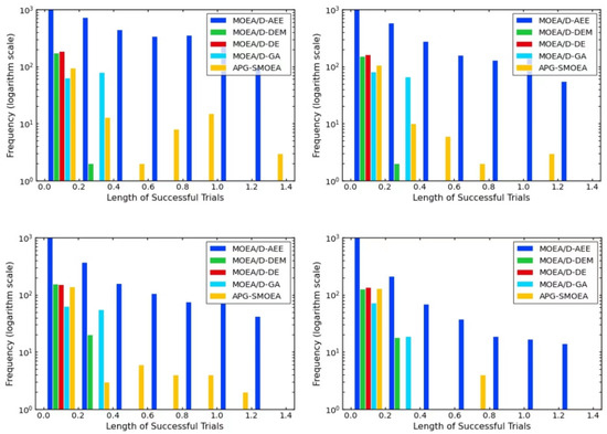 The time complexity of the APG-SMOEA algorithm mainly manifests during the generation process of descendants using Generative Adversarial Networks (GANs). First, we use a fast non-dominated sorting algorithm to select training samples, where the number of objectives is denoted as M, and the population size is N. The time complexity for a single individual undergoing sorting is (requiring comparisons with individuals, each involving comparison of M objectives). The initial round involving N individuals entails a time complexity of . In the worst-case scenario, where only one individual replaces the current non-dominated solution in each round, rounds of sorting are necessary, with each round consuming time complexity, and the worst-case time complexity of the other rounds of sorting is . Thus, the time complexity of the fast non-dominated sorting algorithm is .
