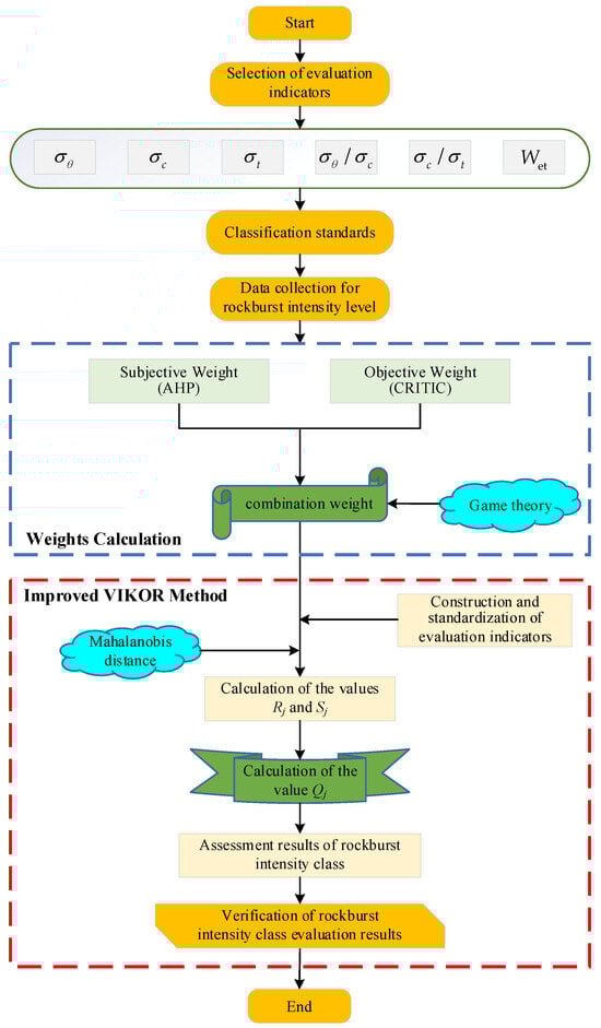 In this study, the game theory comprehensive weighting method and the VIKOR model are used to assess the rockburst intensity grade, and the specific algorithm flowchart is shown in Figure 1.