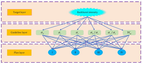 , , , , , and are used as evaluation indicators in this paper. The hierarchical structure of rockburst evaluation constructed by them is shown in Figure 2.