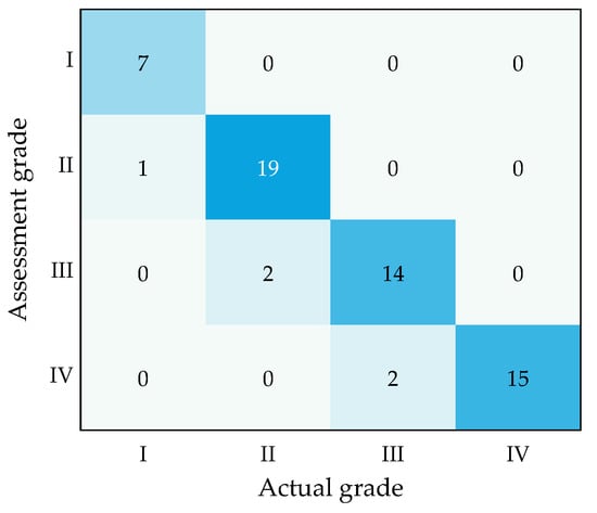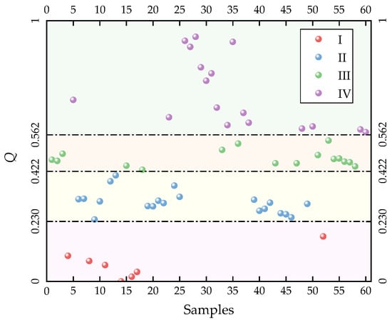 Based on the existing research [,], rockburst intensity can be classified into four levels: no rockburst (level I), weak rockburst (level II), mediate rockburst (level III), and strong rockburst (level IV). The relationship between these levels and the six indicators has been established, and the specific criteria for each single-factor indicator for rockburst are shown in Table 3.