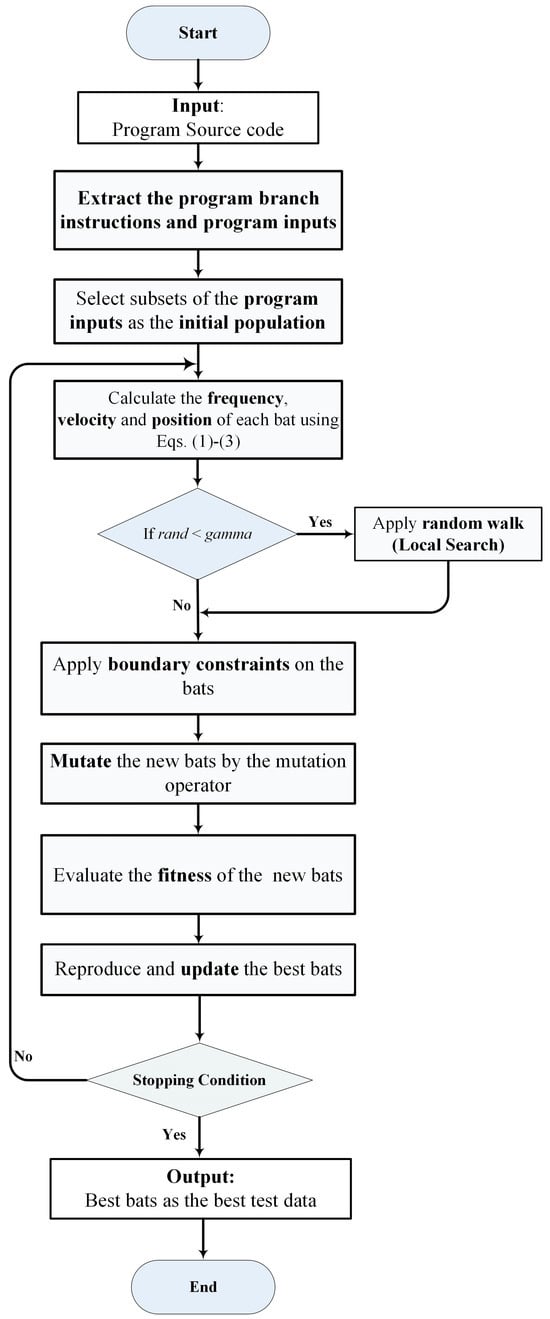 In the BOA, local and global searches are conducted to find the best bat (solution) in the current iterations. Bat positions are updated according to sound loudness Ai and pulse rate ri. Moreover, the global optimal solution is simultaneously updated. The location of the bat (as an array) is encoded as the test data. New solutions (test data) are generated by adjusting frequency based on a fitness function, speed, and location; they are updated by using Equations (1)–(3). Here, β is considered as a random number between 0 and 1 with uniform distribution. Equation (4) was used to implement the local search stage; the location of the current best bat is modified using direct exploitation (random walk). In Equation (4), is a random number with uniform distribution from [−1, 1].
