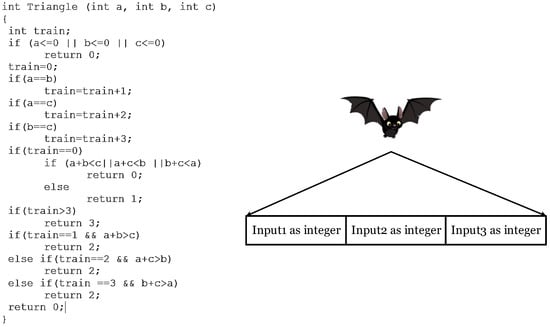 Bats fly randomly at Vi speed in the Xi location with the fmin frequency and different wavelengths of λ and the sound loudness of Ai. Sound loudness may vary from Rmin (the minimum amount) to Rmax (the maximum amount). The position of each bat indicates the input data (test data) of the program. Each bat includes position Xi, pulse frequency fi, initial pulse ri, and sound loudness Ai. Figure 3 shows how to encode the position of each bat in the TDG problem. The BOA typically involves several stages during each iteration. Initialization is the first stage of the BOA. In this stage, a population of bats with random positions in the search space is generated and their velocities and frequencies are randomly initialized. The fitness of each bat is evaluated using the objective function (i.e., Equation (8)). In the second stage, the bat with the best fitness value is selected as the best bat. After selecting the best bat, the velocities of bats based on their current positions and the global best solution are updated; then, the positions of bats based on their velocities are updated (using Equations (1)–(3)). In the third stage, a local solution (bat) is generated around the selected best solution. The fitness of the new bat is evaluated, and the best solution is compared to it. If the new Bat has better fitness than the current global best, the global best solution is updated. The loudness and pulse rate are updated.