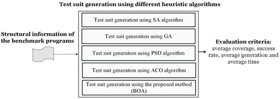 In this investigation, the best test data with the most branch coverage were produced using the modified BOA. The effectiveness of the suggested strategy for producing test data was assessed and investigated through a series of experiments and tests on benchmark programs. Figure 4 shows how experiments are conducted.