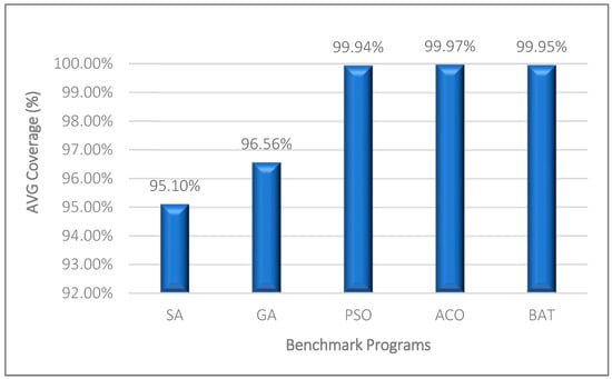 The program’s source code is divided into classes and functions; huge programs are made up of classes and functions towards the end. Contrarily, according to programming best practices, a function contains between 20 and 100 lines of code. The benchmarks utilized in this paper are extremely established and popular. Additionally, any programming constructions that can be applied to complicated software in the actual world are included in these benchmarks. These benchmarks employ every possible conditional, loop, arithmetic, logical, and jump operator and instruction. The same results can be produced by the suggested technique in real-world programs. The produced test data by the suggested methods in the triangleType, Cal, and Reminder benchmarks is 100%, as shown in Table 5. The suggested approach generates test data that has approximately 99.99% coverage. The suggested approach achieves 99.93% coverage in calDay, whereas PSO and ACO algorithms produce 100% coverage for this program. In terms of average coverage, the suggested strategy works better overall.