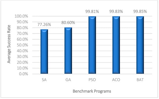 The suggested technique, together with the SA [], GA [], ACO [], and PSO [], was implemented in MATLAB programming language v2016a. In the current investigation, an identical hardware setup with 8GB RAM, Intel Core i7 CPU, and Windows 10 OS was used for all trials. MATLAB is a programming language with outstanding functions for computational operations; it offers numerous demonstrational computation features and programming.