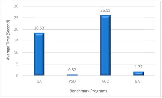 Another assessment factor that was taken into account was the amount of time needed to produce the test data with the greatest possible coverage. A related algorithm’s fast speed is shown by less time spent producing test data. Table 7 displays the AET required to produce test data using various techniques. The suggested approach outperforms the GA and the PSO algorithm in terms of speed, as shown by the results collected and shown in Table 7. In triangleType, calDay, isValidDate, Cal, and Reminder benchmarks, the BOA method as well as the ACO method have higher speeds (lower time consumption) than the other methods. Indeed, can generate effective test data in less time and cost.