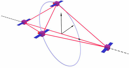Other works on tetrahedral configurations include the construction of tetrahedrons that span the Earth [14], and the study of signal delay properties for global positioning satellites [15]. The maintenance of a tetrahedral formation using a solar sail is considered in papers [16,17]. The problem of launching and maintaining a tetrahedral formation of a small spacecraft in a highly elliptical orbit was solved using semi-analytical and numerical methods in [18]. A publication related to The Auroral Lites mission deserves special mention [19].