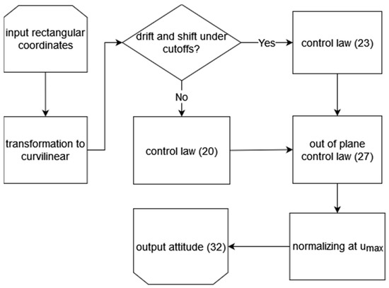 We synthesize the control algorithm using the direct Lyapunov method. Our goal is to ensure that relative amplitudes , relative drifts and shifts , and phases correspond to the reference values defined by Equations (10)–(12). Let us again note that in case of aerodynamic drag forces, out of the three components of the control acceleration, the value of the force component is at least an order of magnitude greater than the values and . Due to that fact, we neglect the values and while synthesizing the control in the direction. That allows us to split the whole control into three different parts.