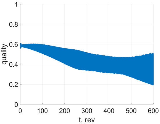 As can be seen, the quality of the tetrahedron is within 0.4 over approximately 200 revolutions, and within 0.2 over 600 revolutions. The tetrahedron remains non-degenerate for about 1000 revolutions (about 60 days). It might be explained by increased values of disturbances, both from non-linear terms in relative motion equations and additional harmonics in the Earth gravity model.