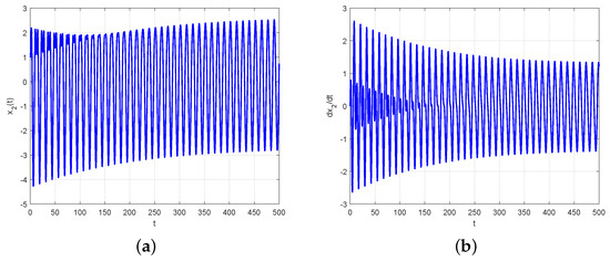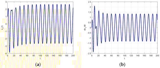This example is simulated using MATLAB based on the provided parameters. Figures 1a, 4a and 7a display the three state trajectories representing the anti-periodic solution for the CGNNS system. These trajectories correspond to the same initial values, , respectively. Additionally, we confirm the satisfaction of the conditions stated in Theorem 1. As a result, the system in the given example possesses a unique -anti-periodic solution, and all other solutions exhibit exponential convergence towards it as .