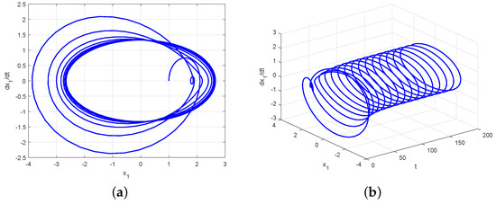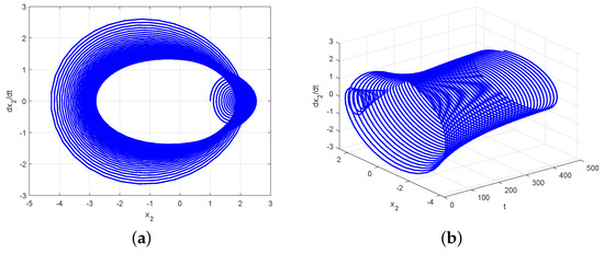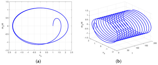 The phase portrait (a) of and , and the 3D graphics (b), with the initial value .