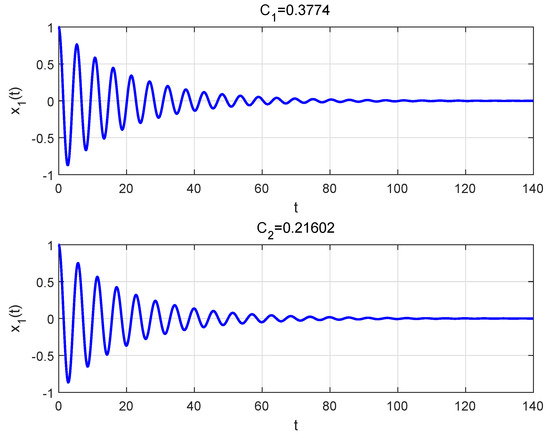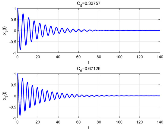 The state trajectory of , Figure 7a shows the initial value , and Figure 7b shows the trajectory of with the initial value . The phase portrait, Figure 8a, displays and , while Figure 8b presents a 3D graphic with the initial value . The convergence curve, Figure 9, illustrates for the system (1) with different values .