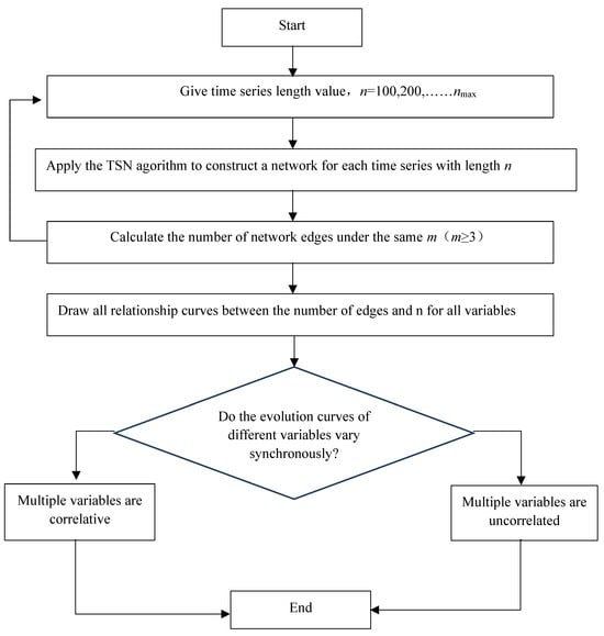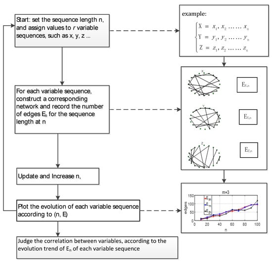 The variable n is the length of the time series. When n is updated, a new network is constructed with a selected phase space reconstruction dimension m (generally m = 3). Then the number of edges En is recorded once, where E represents the number of edges. According to the above process, En of each variable is obtained. Then, the evolution graph of the En sequence is drawn. According to the evolution pattern of the En of different variables, the relationship between different variables is studied. The principle of the method is shown in Figure 1.