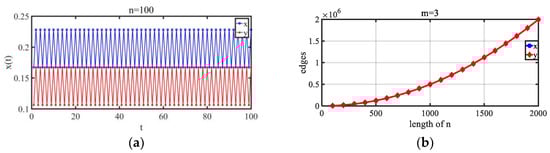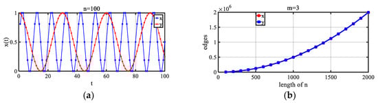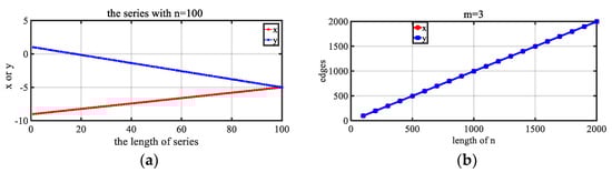 As shown in Figure 3, although the values of the two linearly divergent sequences x and y and the function images were different, using the TSN method, the network from either sequence x or y was a tree with the same number of edges. Additionally, as the sequence length n gradually increased, the changing trend of the edges of x and y followed the same pattern. The above results show that, provided it is a linearly divergent sequence, its internal dynamic topological structure is constant. In this study, the internal dynamic topological structure refers to the system spatial diffusion ability and aggregation ability.