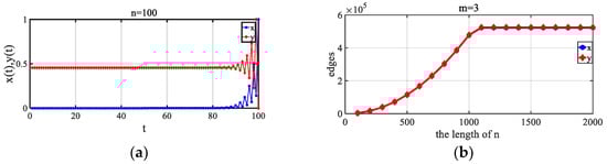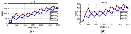 - Within the same chaotic system, as time increases, the randomness of different variables may change differently, that is, the relative strength of the randomness among different variables changes. Therefore, the number of edges in networks mapped by different variables changes a little differently when the overall change trend is similar. For example, sometimes the x sequence is greater than the y sequence edge in the initial stage, but, over time, the number of edges of the y sequence may become larger than that of the x sequence. In any case, the overall change trends exhibited by the number of edges in the network either mapped by x or y are the same or similar.