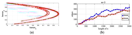 Trend exhibited by the number of edges in the network from the Henon map. (a) Henon map. (b) Trend of the number of edges in the network for the x and y series with time going by. For the time series of the Henon map, x and y are nested within each other. As the time series length n increases, the trends of the two series are essentially the same. The results show that the chaotic nature of the time series of the Henon system is stable.
