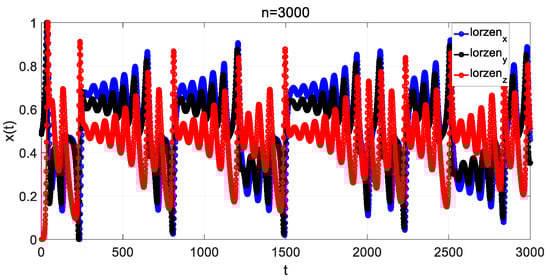 For the time series of the Rossler map, x, y, and z are nested within each other. As the time series length n increases, the change trends exhibited by y and z are exactly the same. Although the change trends of the x series compared with those of the y and z series exhibit small, localized differences, they are approximately similar overall. The trends of the three series are essentially similar. For Rossler sequences, we also experimented with different m values, and the change trends of x, y, and z were similar under different values of m. This shows that our algorithm is stable for the display of the essence of the system under different values of m.