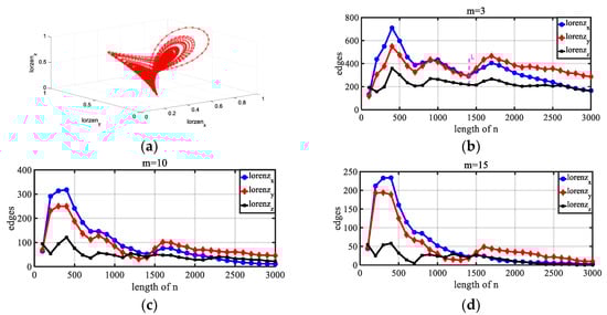 Trend exhibited by the number of edges in the network from the Lorenz map in the x, y, and z directions. (a) Lorenz map. (b–d) Trends exhibited by the number of edges in the network for the x, y, and z series with time going by at m = 3, 10, 15.